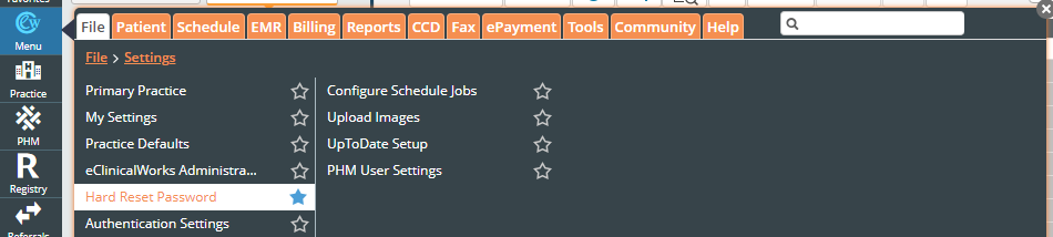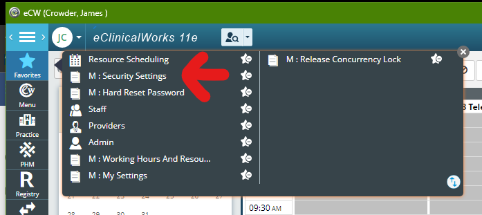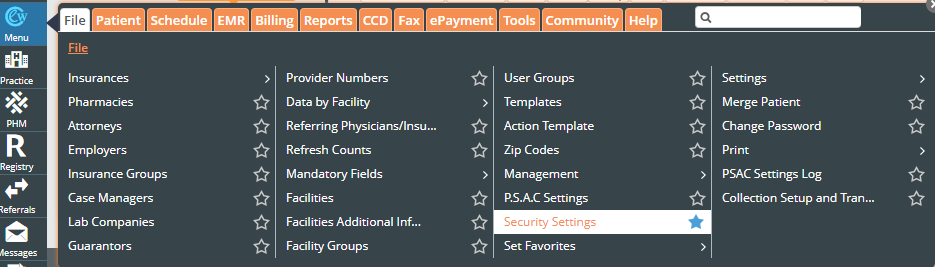 Log in to eCW, click Menu, then File, then click the star next to "Security Settings" to set it as a favorite: